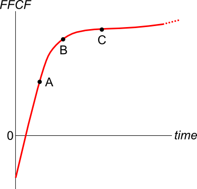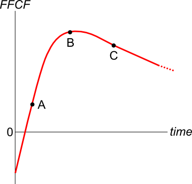 From t=4 onwards, these positive cash flows will grow at the lower rate -3% pa (note the negative sign) in perpetuity. So the subsequent cash flows will be: